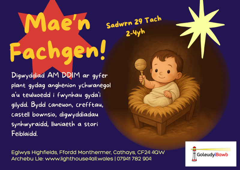 Dewch â’ch teulu i fwynhau castell bownsio, lluniaeth, ardal dawel/synhwyraidd, canu, a chrefftau syml gyda’ch gilydd. Yn ystod y digwyddiad, bydd pryd ‘gyda’n gilydd’ pryd bydd pawb yn dod at eu gilydd am gael stori Feiblaidd ryngweithiol a chanu caneuon Cristnogol.